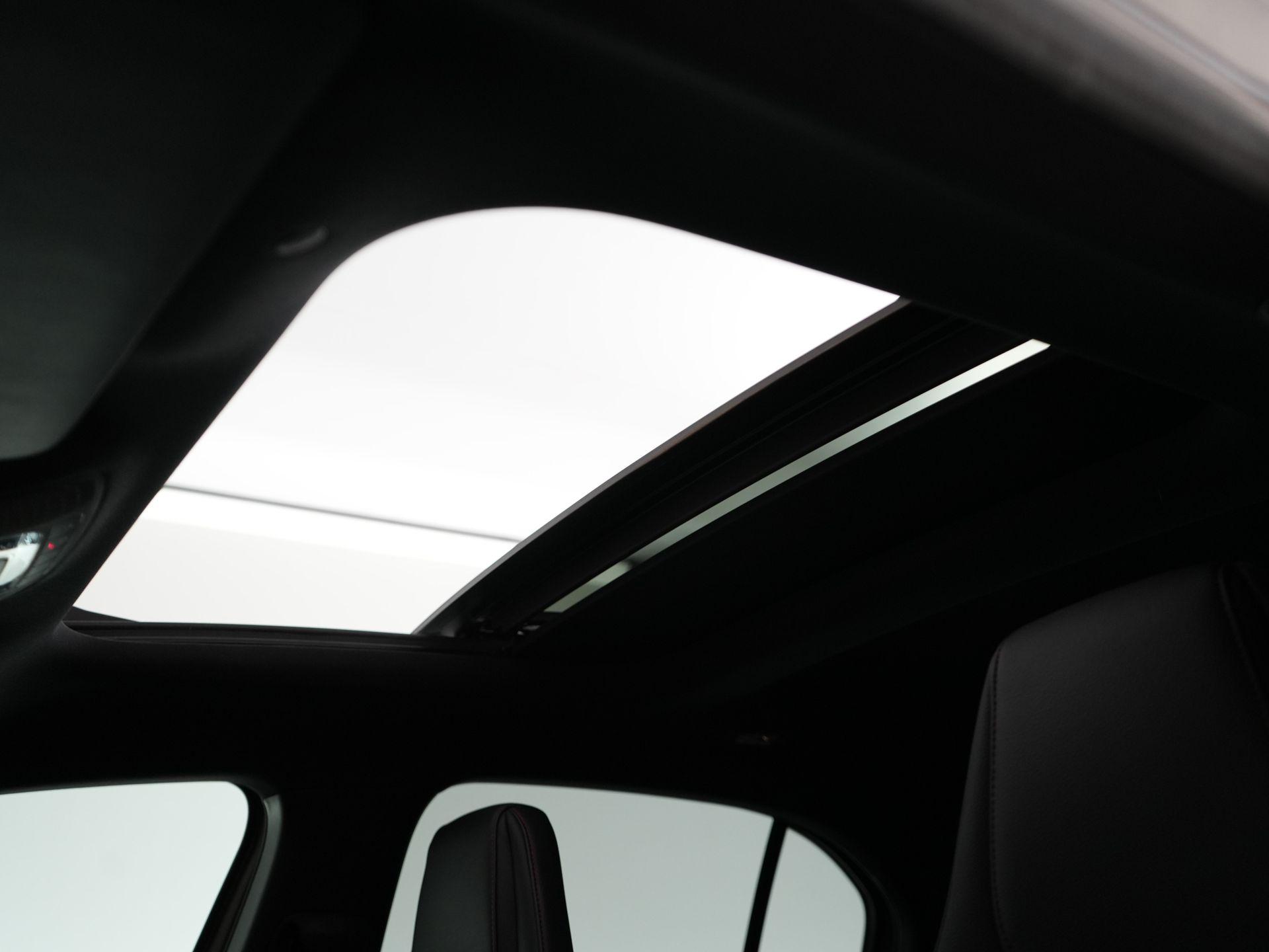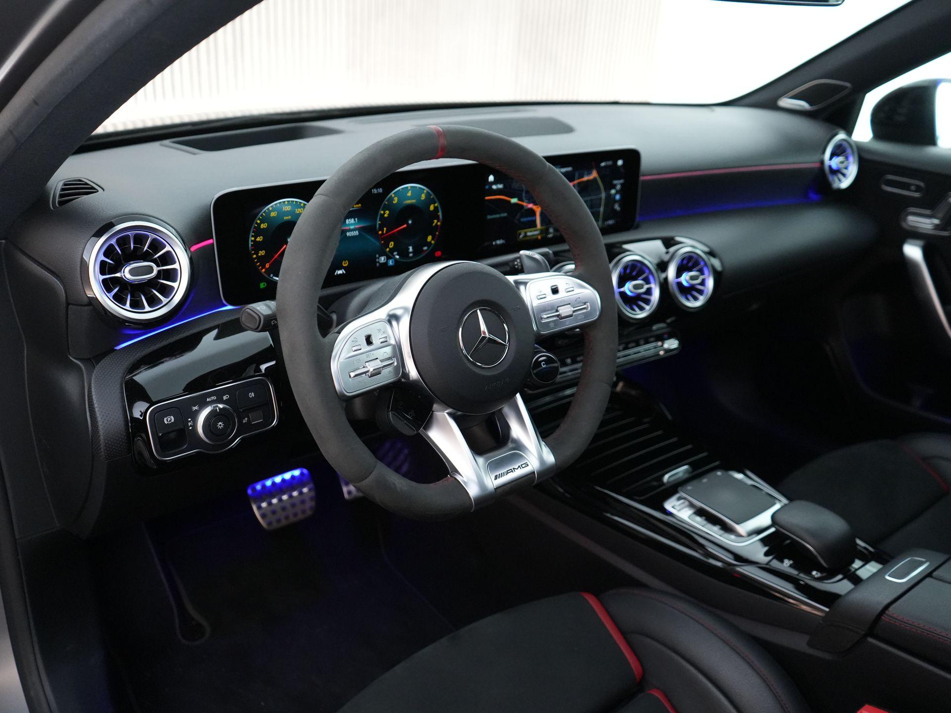 Het interieur is volledig in AMG-stijl uitgevoerd: Performance stoelen met rode gordels, een AMG-stuur in microvezel met Drive Unit-knoppen en sfeerverlichting rondom. De afwerking is hoogwaardig, met zwarte hemelbekleding, AMG-vloermatten en verlichte instaplijsten.
