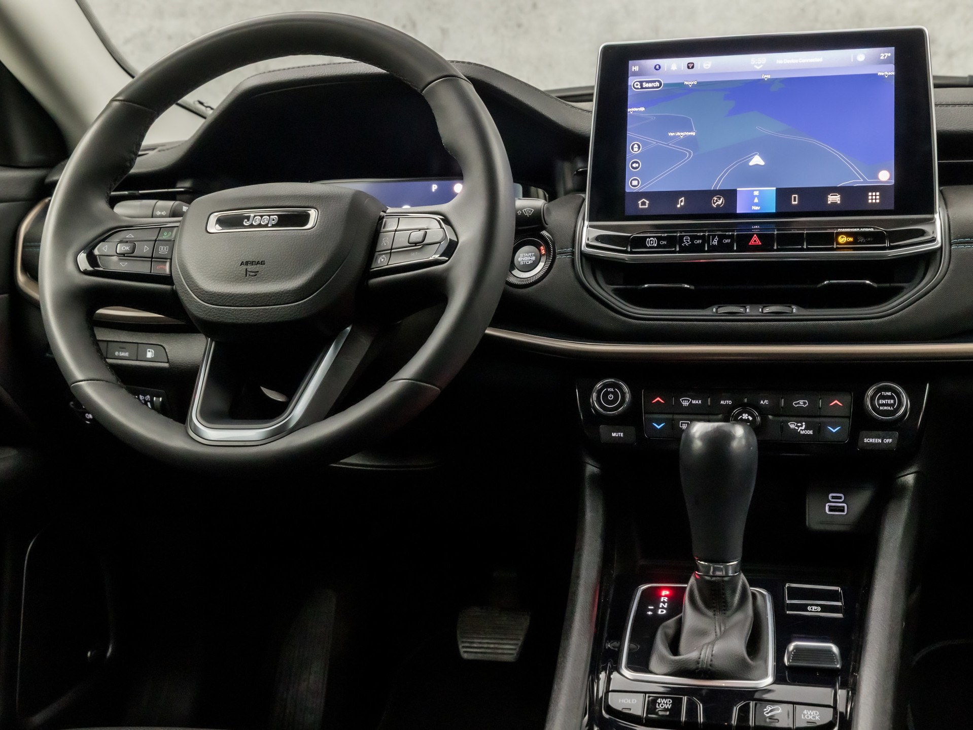 Aan boord van deze Jeep houden verschillende geavanceerde systemen voor u de weg in de gaten. Ze waarschuwen u voor noodsituaties en kunnen in een aantal gevallen ook zelf ingrijpen. Dat de auto steeds meer taken van de bestuurder overneemt, merkt u bijvoorbeeld aan het systeem voor verkeersbord-detectie in deze auto. Met het Lane-keeping systeem komt u nooit per ongeluk buiten de rijstrook. In een noodsituatie waarschuwt forward collision warning bij een dreigende aanrijding met een voorligger. In deze Jeep vinden we verder een dodehoekdetectie, hill hold functie, vermoeidheidsherkenning, autonoom remsysteem en bandenspanningcontrolesysteem.