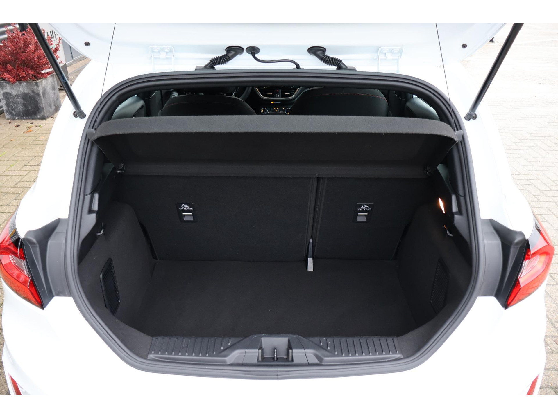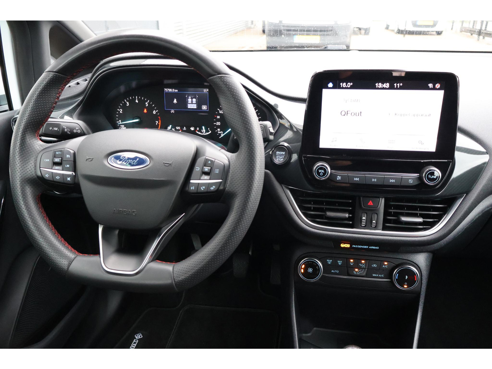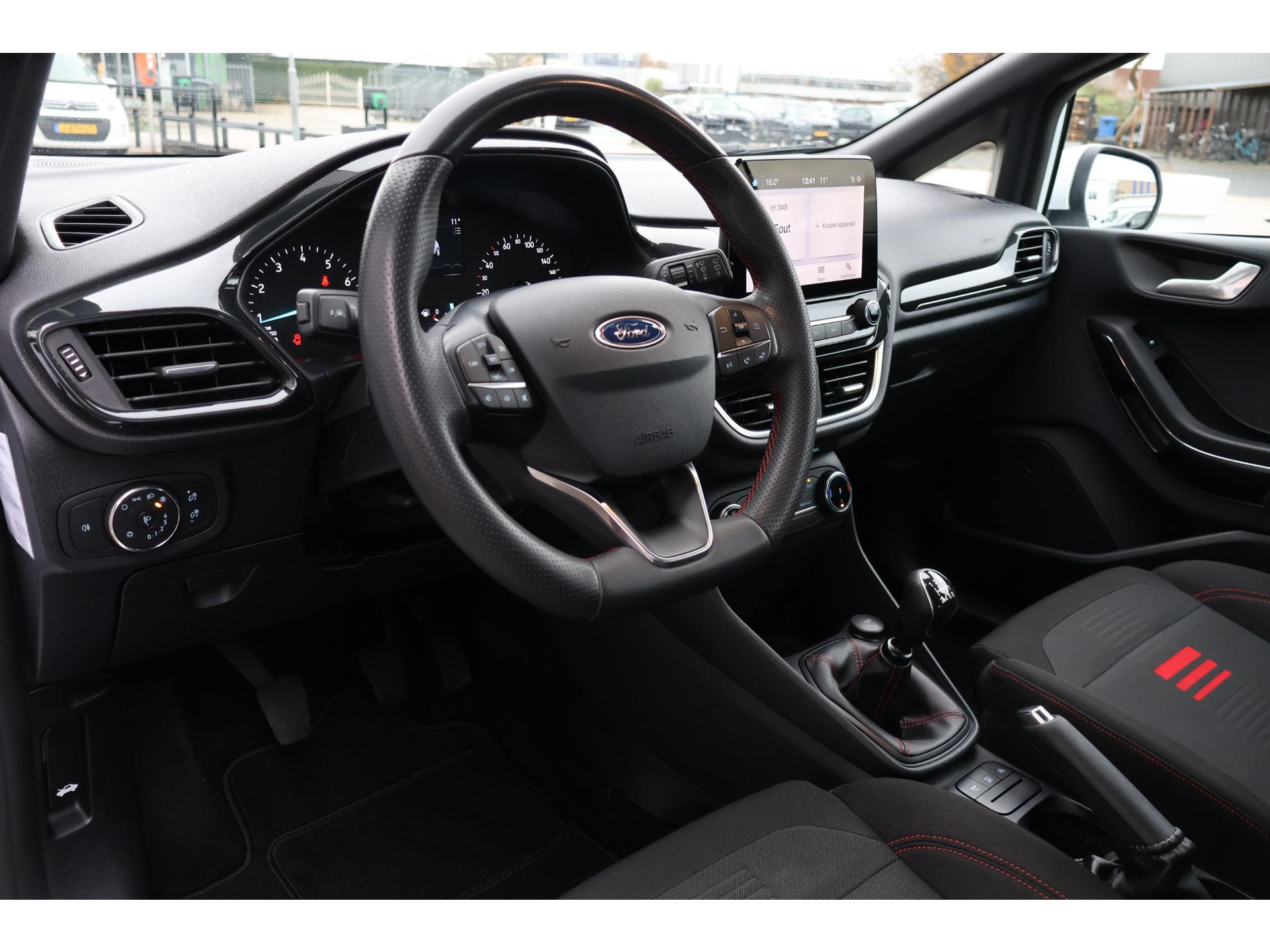 Interieur: zwart/rode stiksels, Stof