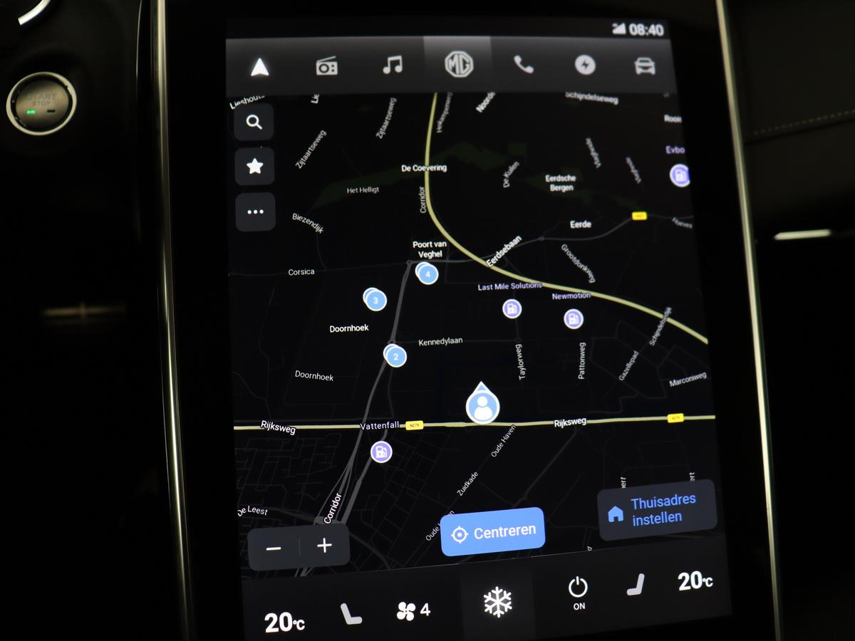 Voor het overzicht tijdens iedere rit is deze MG Marvel R voorzien van een gemakkelijk afleesbaar digitaal dashboard. Door het combineren van beelden van vier camera's, biedt de 360 graden camera een naadloos en gedetailleerd beeld van de hele omgeving rondom deze auto. Als u de adaptive cruise control inschakelt, regelt de auto zelf de snelheid en de afstand tot de auto voor u. Na een lange werkdag in de file: daar zit niemand op te wachten. Gelukkig helpt de file assistent een handje. Het radarsysteem meet de ruimte tot de voorligger en bewaakt de juiste afstand. Stilstaan? Dan remt en stopt de auto vanzelf. Zoals u van zo'n jonge auto mag verwachten, zijn hier ook de geavanceerde remote services aanwezig. Simpelweg met een app op uw smartphone controleert u op afstand de status van de auto en bedient u diverse functies. Ook is de MG uitgerust met: dashboard met spraakbediening, full map navigatiesysteem, electronic climate control, draadloos opladen, DAB ontvangst en regensensor.
