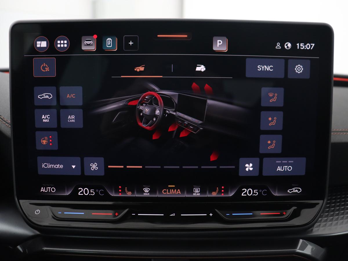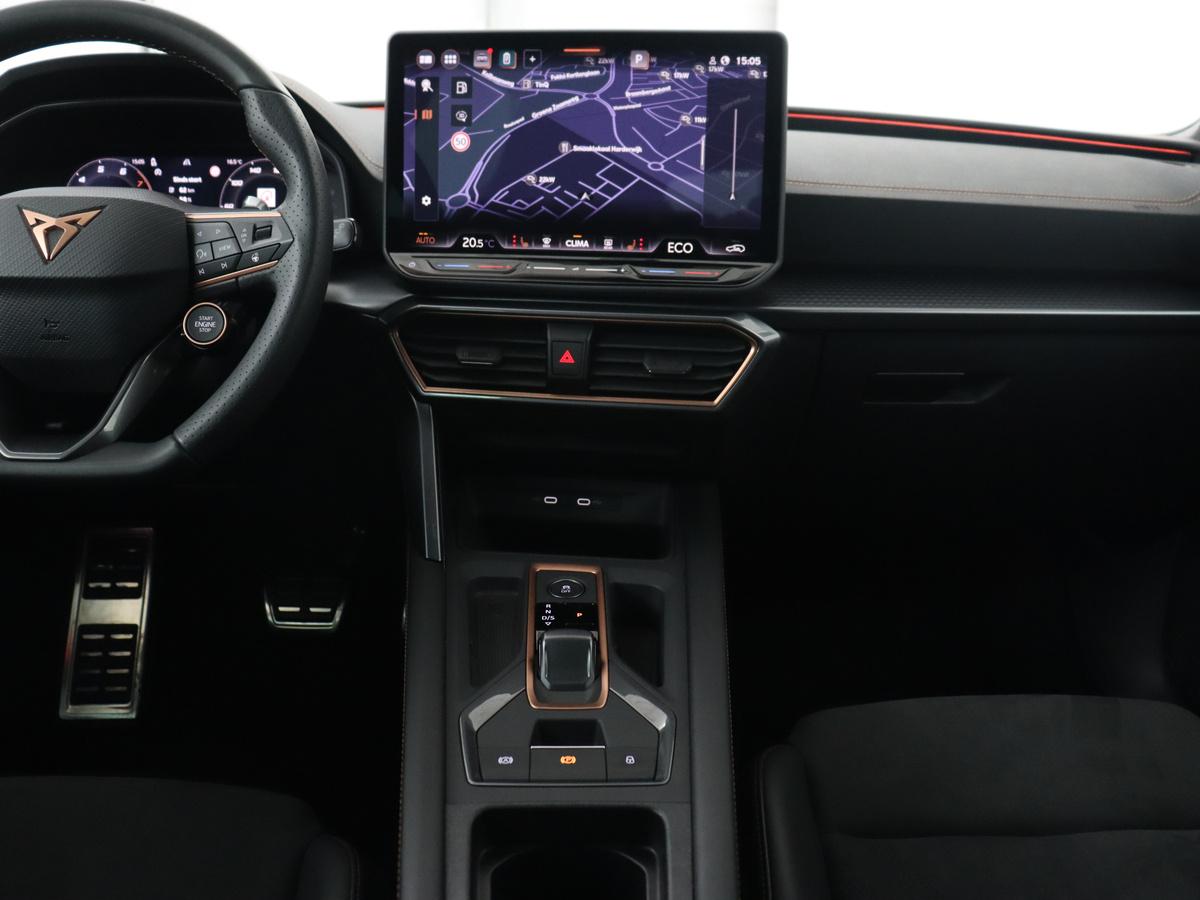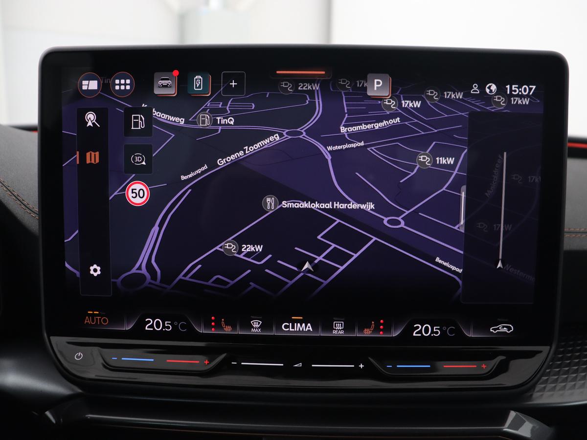 Het digitale dashboard in deze auto maakt personalisatie van uw cockpitinterface mogelijk. Nekkramp en verdraaide schouders zijn verleden tijd. Door de achteruitrijcamera is iedere meter achter de auto glashelder in beeld. Adaptive cruise control is veilig en comfortabel. De snelheidsregelaar houdt automatisch afstand tot het voertuig dat voor u rijdt. Na een lange werkdag in de file: daar zit niemand op te wachten. Gelukkig helpt de file assistent een handje. Het radarsysteem meet de ruimte tot de voorligger en bewaakt de juiste afstand. Stilstaan? Dan remt en stopt de auto vanzelf. Kilometerstand? Oliepeil? Accuspanning? Allemaal te zien via de app. Overal. Altijd. Dankzij Connected Services. U bent in deze CUPRA ook voorzien van dashboard met spraakbediening, full map navigatiesysteem, automatische airconditioning, draadloos opladen, DAB ontvangst en regensensor.