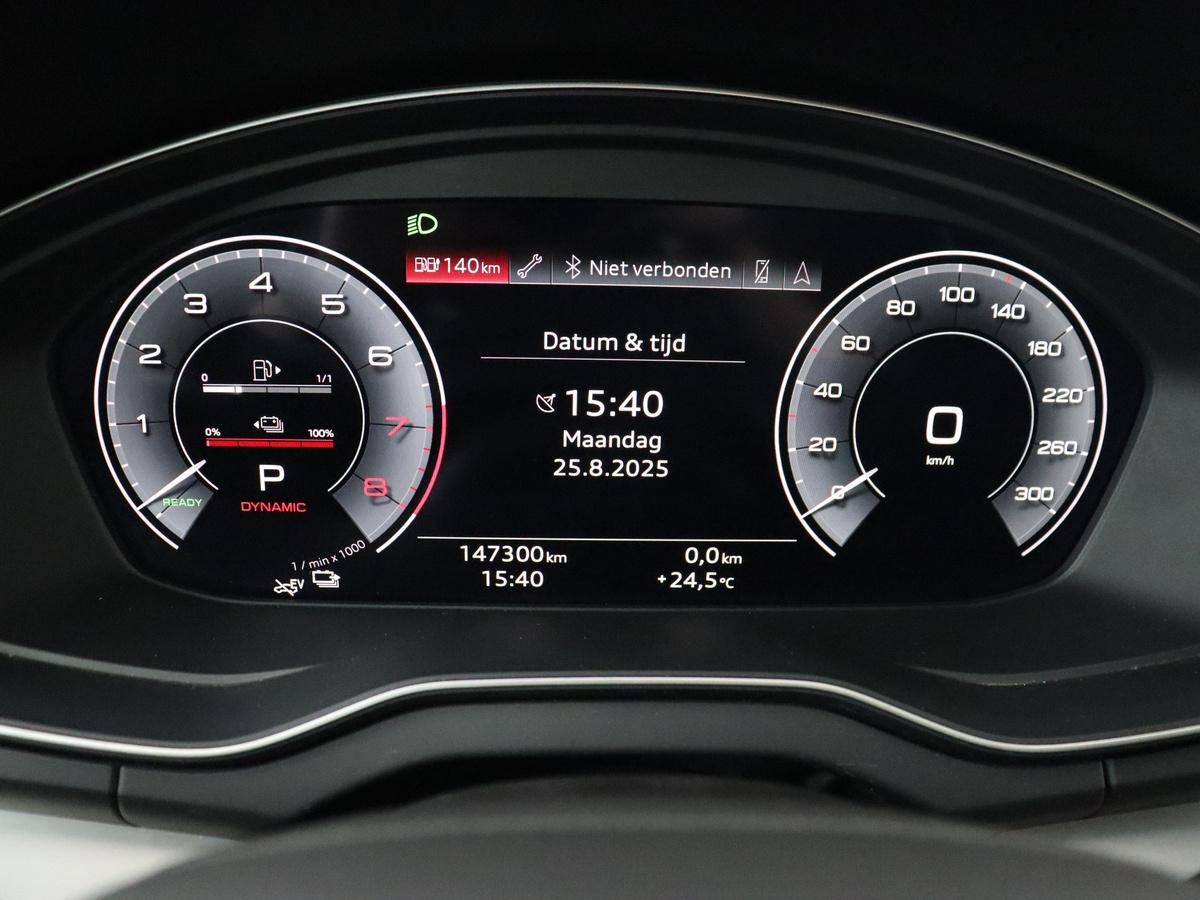 Het personaliseren van uw cockpitinterface is mogelijk met het digitale dashboard in deze auto. Wat een gemak, die achteruitrijcamera. Alles in beeld zonder capriolen. Met adaptive cruise control houdt de auto zelfstandig afstand tot uw voorligger. Een veiligheidsverhogende optie waarmee u comfortabel onderweg bent. Kop aan kont langzaam rijden: dan is afstand houden soms lastig. De file assistent helpt en zorgt automatisch voor veilige ruimte tot de voorligger. Ook als die tot stilstand komt. Ook de akoestiek in de auto wordt optimaal benut door het high performance audiosysteem. Ook is de Audi uitgerust met: full map navigatiesysteem, WIFI-hotspot, automatische airconditioning, sportstuur met schakelpaddels, draadloos opladen en DAB ontvangst.