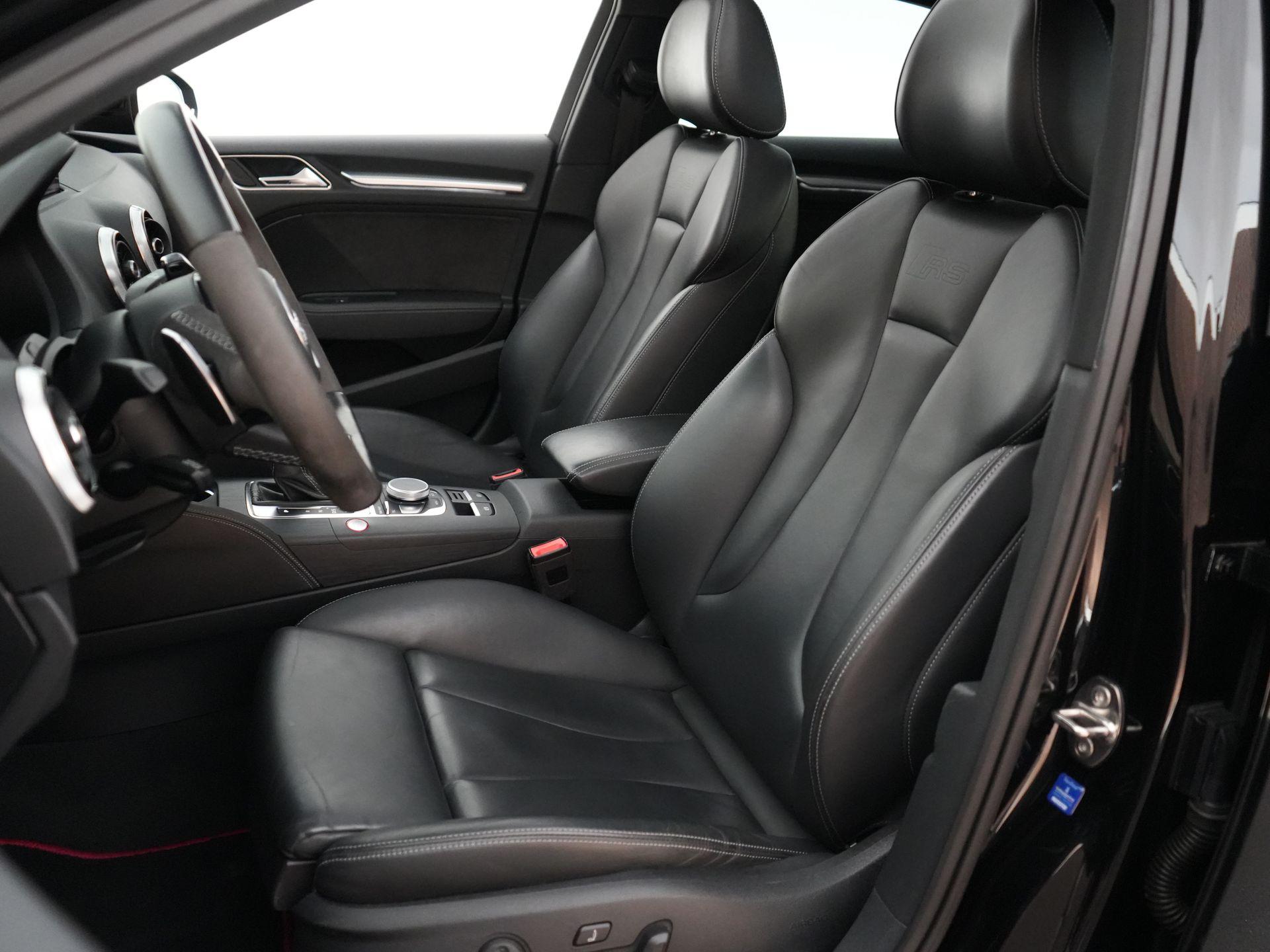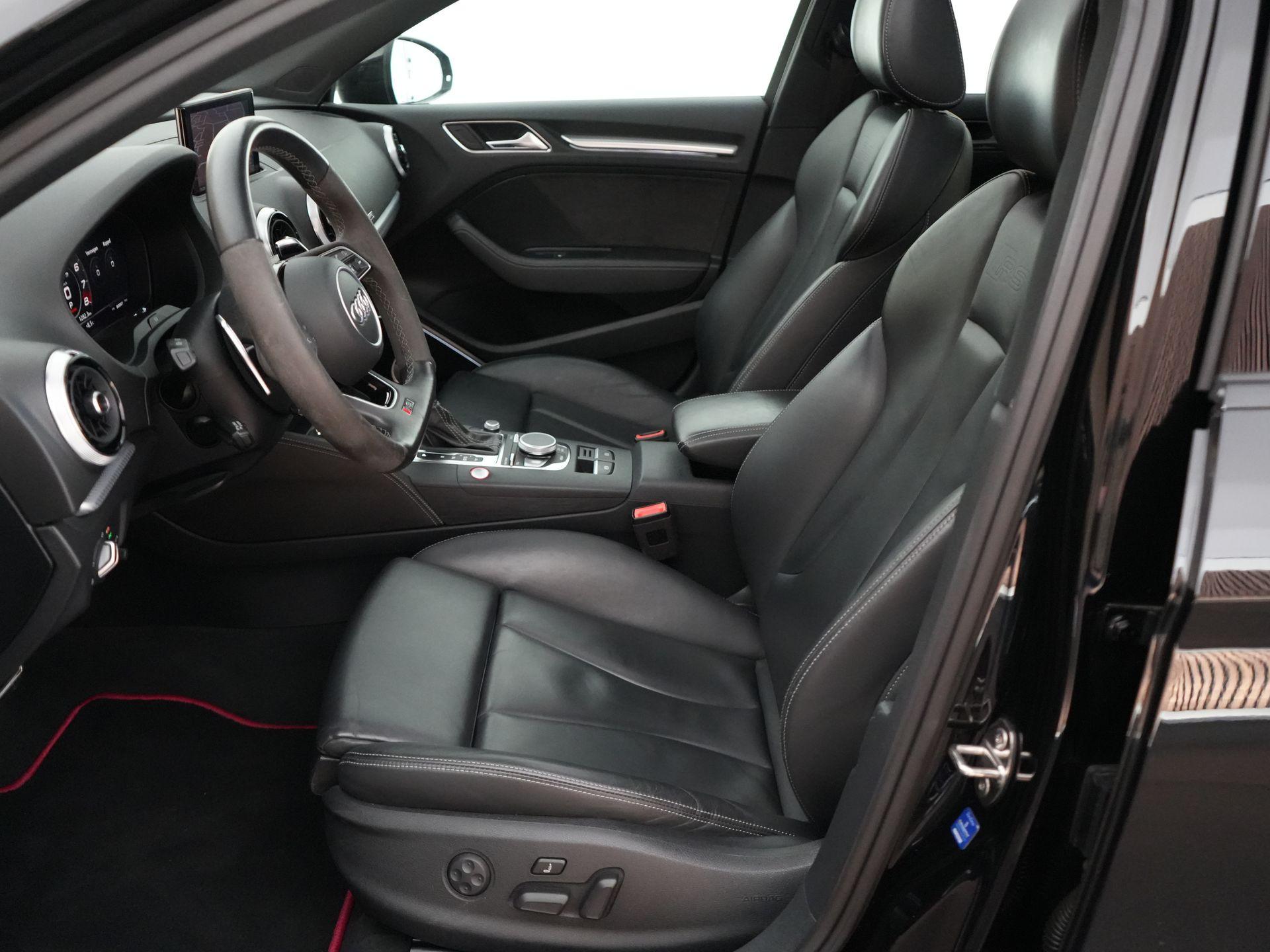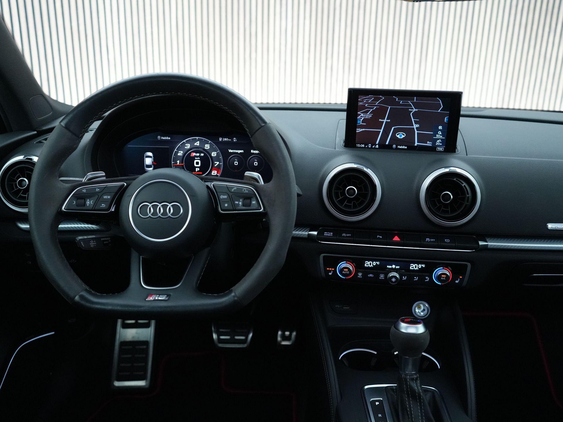 Dit exemplaar is daarnaast bijzonder compleet uitgevoerd en voorzien van een zeer aantrekkelijke optielijst. Denk aan het panoramisch glazen schuifdak, Bang & Olufsen soundsysteem, MMI Navigation Plus met MMI touch, Audi virtual cockpit, comfort key, stoelverwarming, sportstoelen vóór en een fijn nappalederen interieur met contraststiksels. Ook aan comfort en veiligheid is gedacht met onder meer adaptieve cruise control met stop&go, het assistentiepakket, achteruitrijcamera, Parkeerhulp Plus en Matrix LED koplampen met dynamische knipperlichten. Precies zoals je een RS3 wilt hebben: sportief, luxe en compleet.