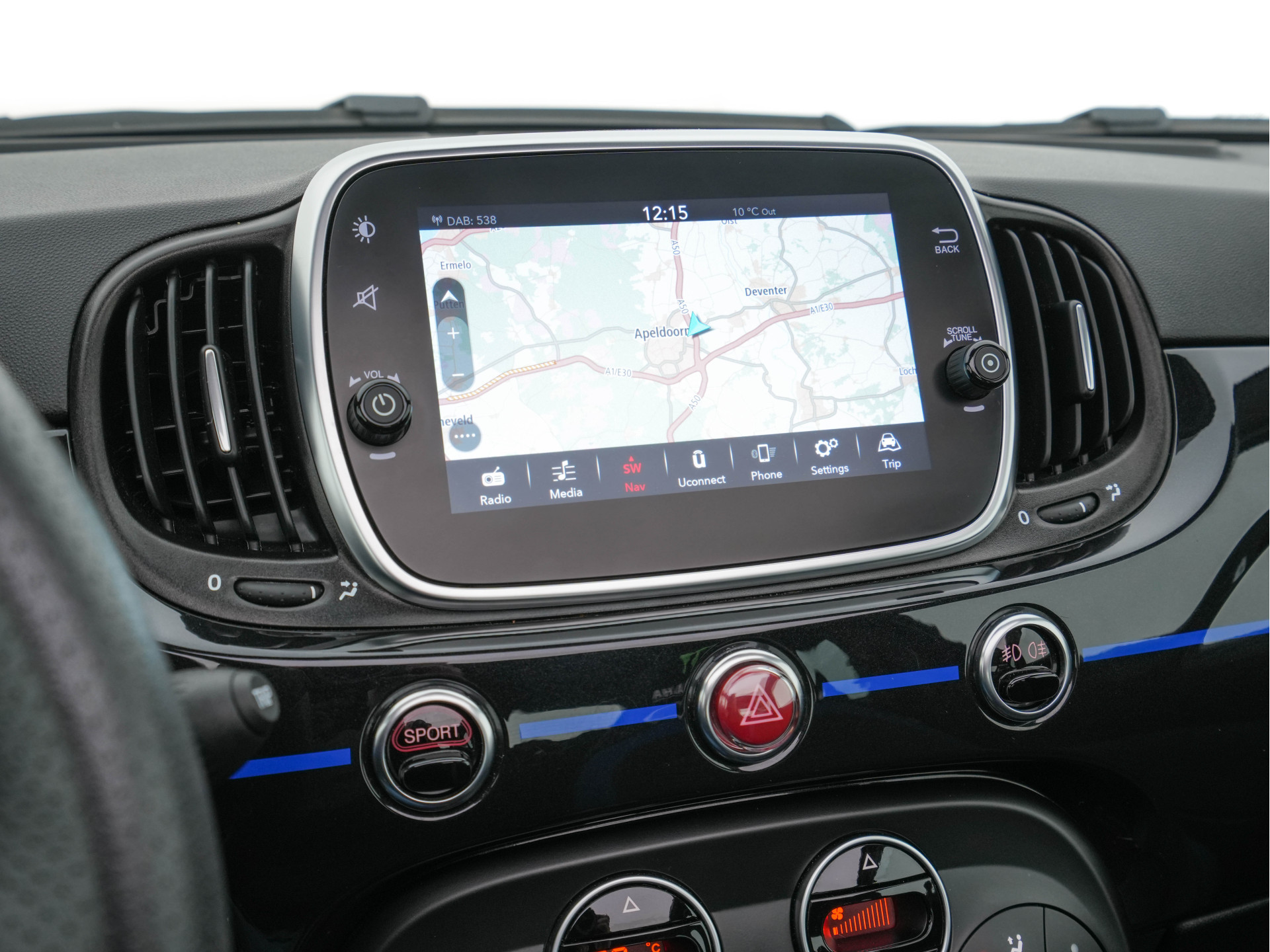 ✔ Interieurdetails: Naast de unieke zwart-blauwe stoffen bekleding , heeft de autoa speciale logo (zoals het Monster Energy Yamaha MotoGP-logo op het startscherm van het infotainmentsysteem) en het Abarth Telemetriesysteem om prestaties te meten.