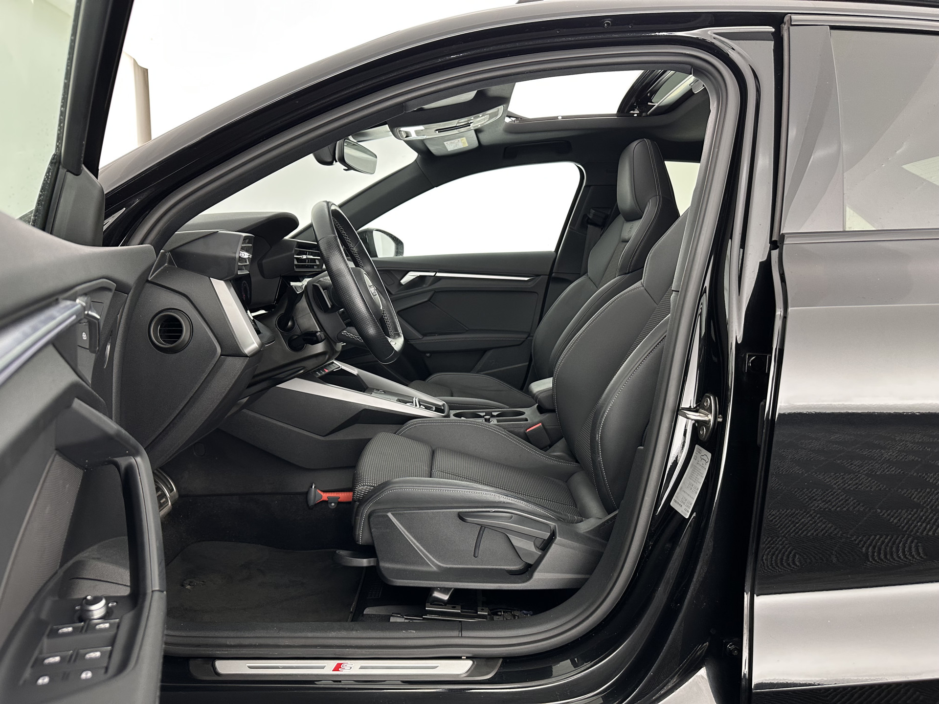 ⭐ Audi A3 Limousine 35 TFSI S-Line Edition in Mythos Black Metallic met Black leather –Rock Grey fabric “Pulse” combinatie met S-logo | Sportief, Luxe & Geavanceerde Technologie