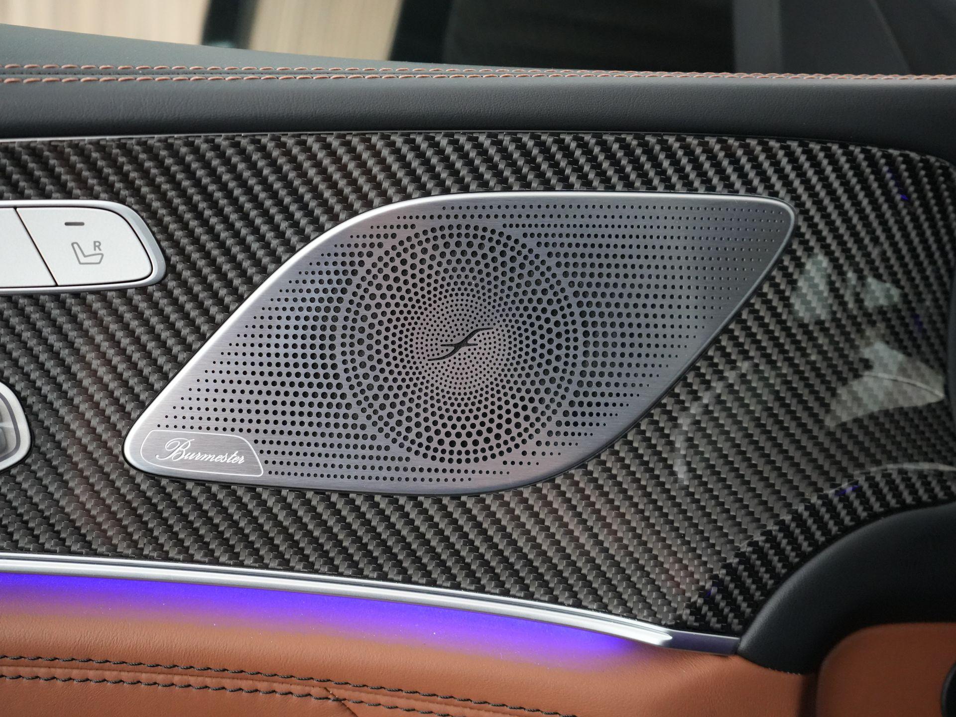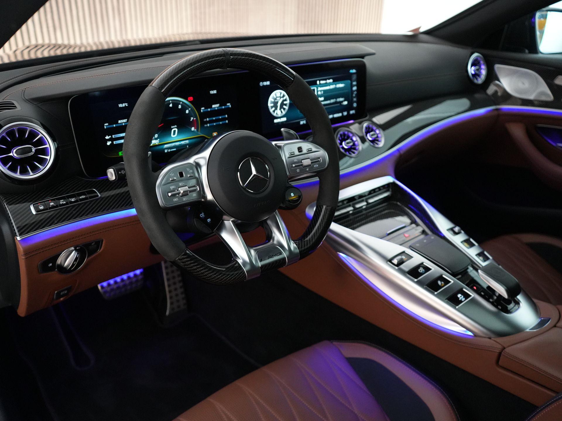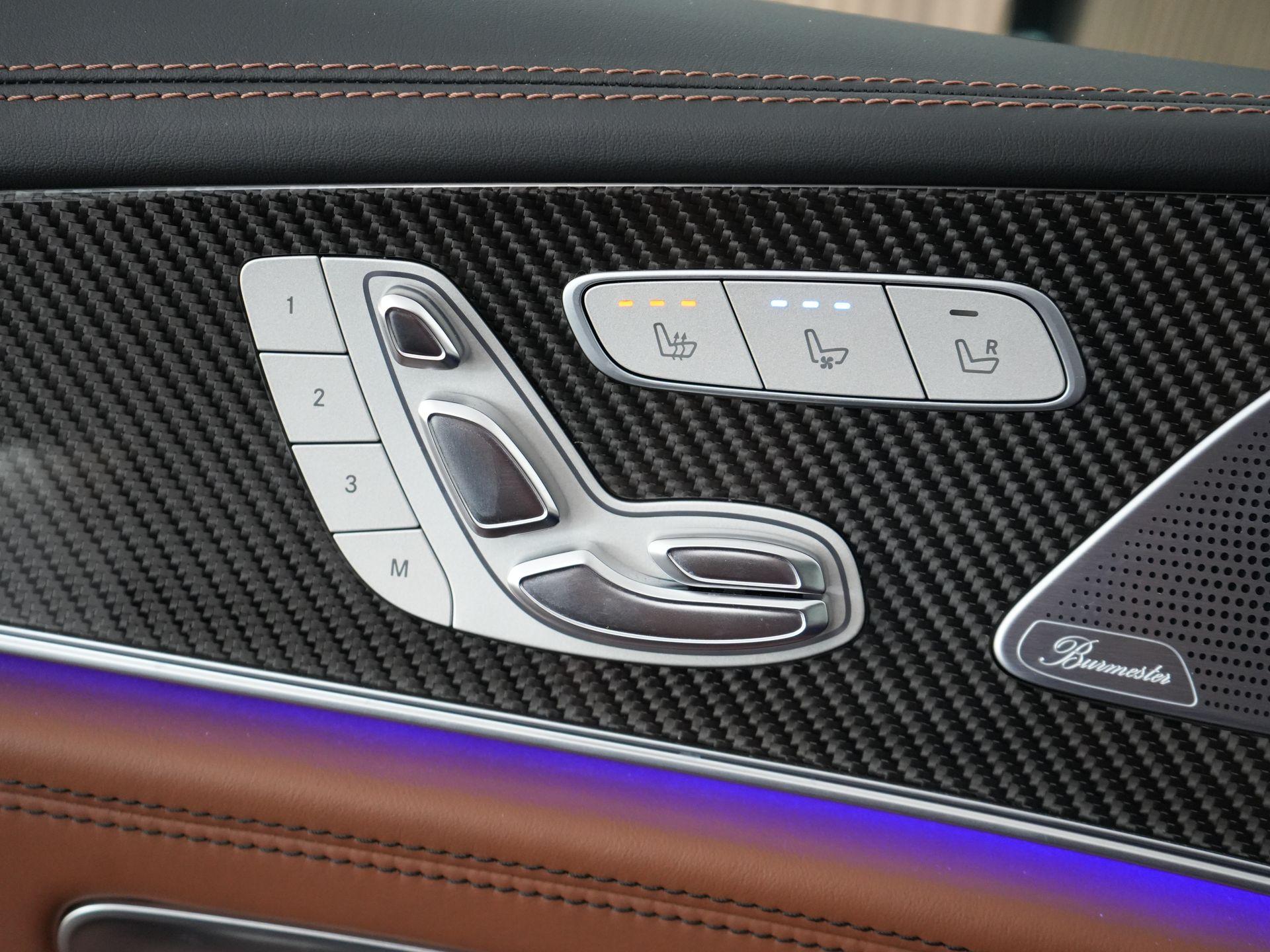Buiten laat hij direct zien dat het menens is: AMG carbon exterieurpakket, carbon buitenspiegels, statische carbon achterspoiler, hoogglans Shadow Line, 21 inch AMG dubbelspaaks velgen en donker getint glas.