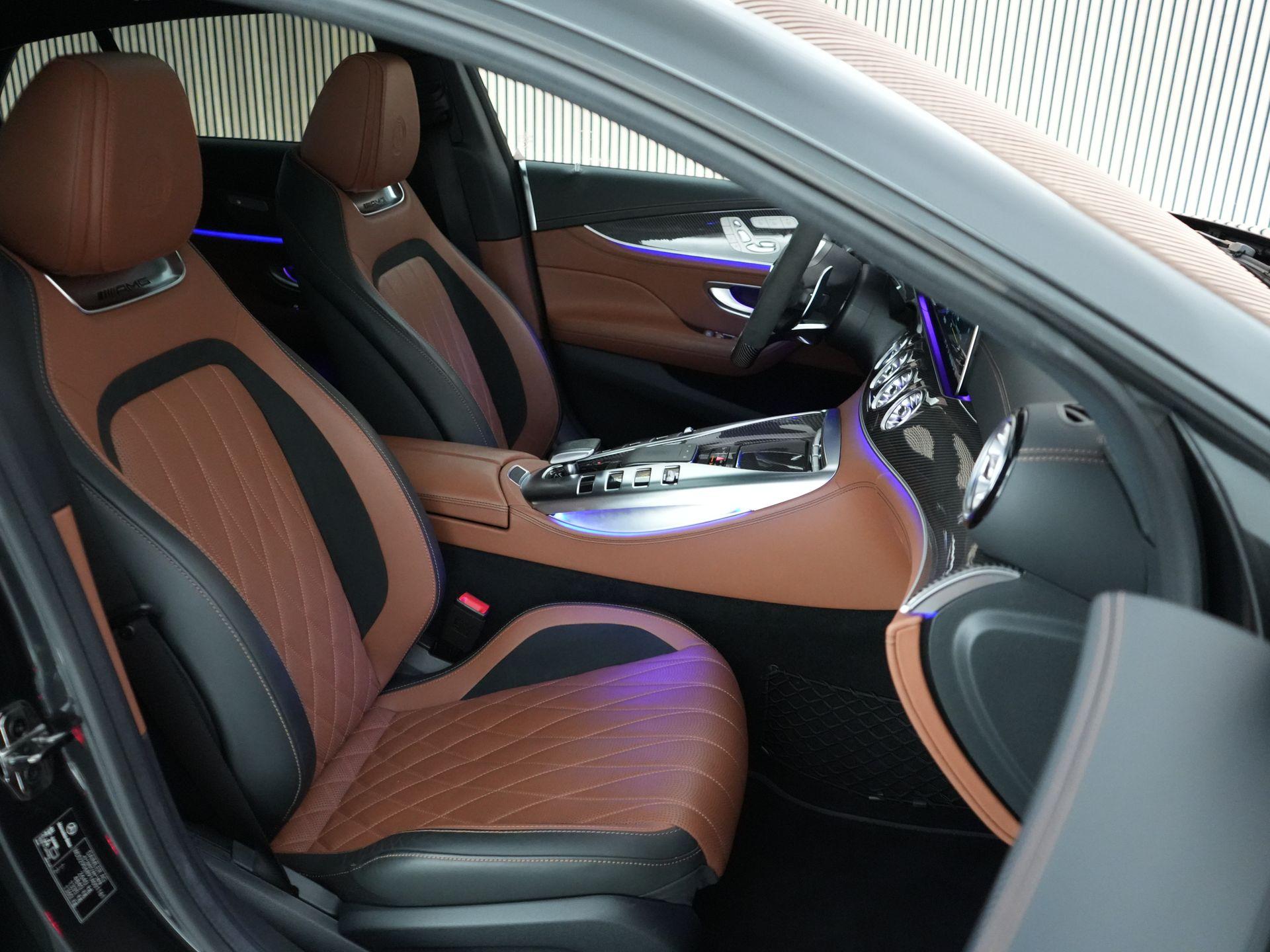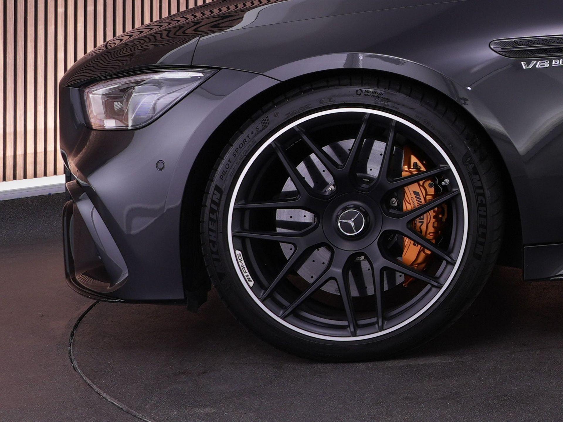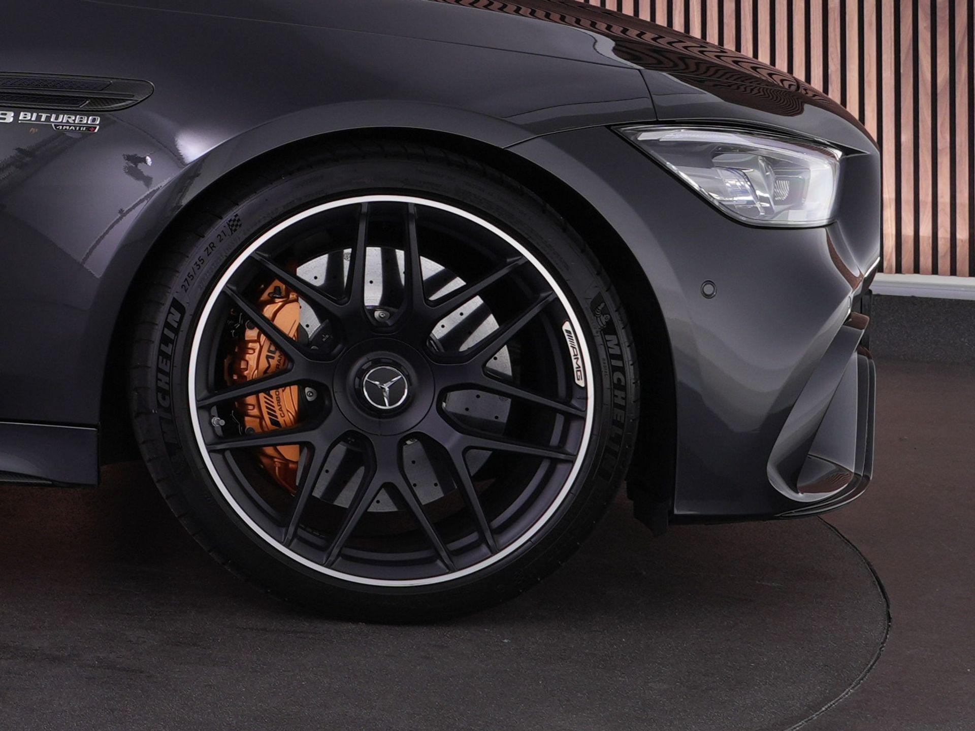 Buiten laat hij direct zien dat het menens is: AMG carbon exterieurpakket, carbon buitenspiegels, statische carbon achterspoiler, hoogglans Shadow Line, 21 inch AMG dubbelspaaks velgen en donker getint glas.