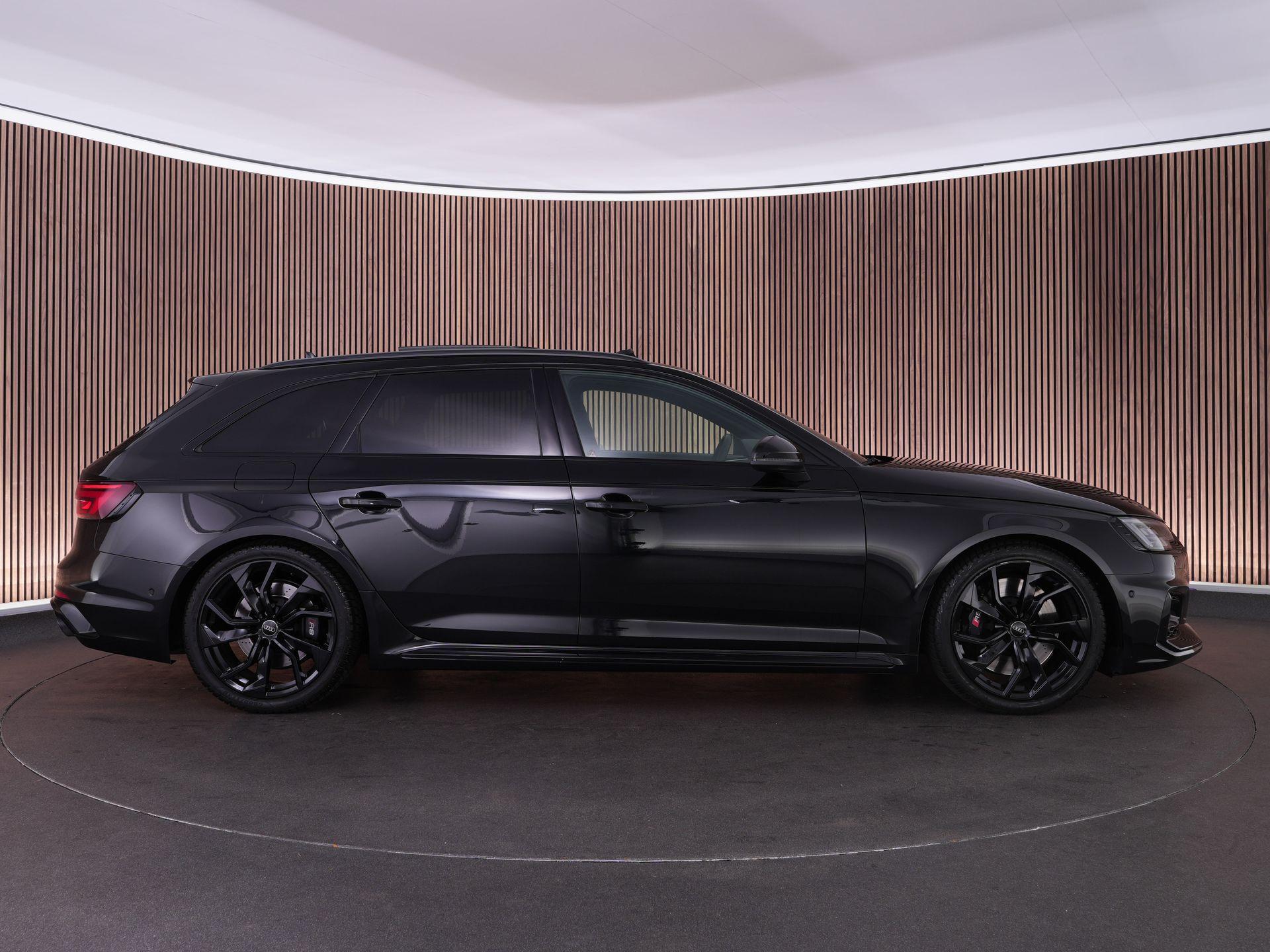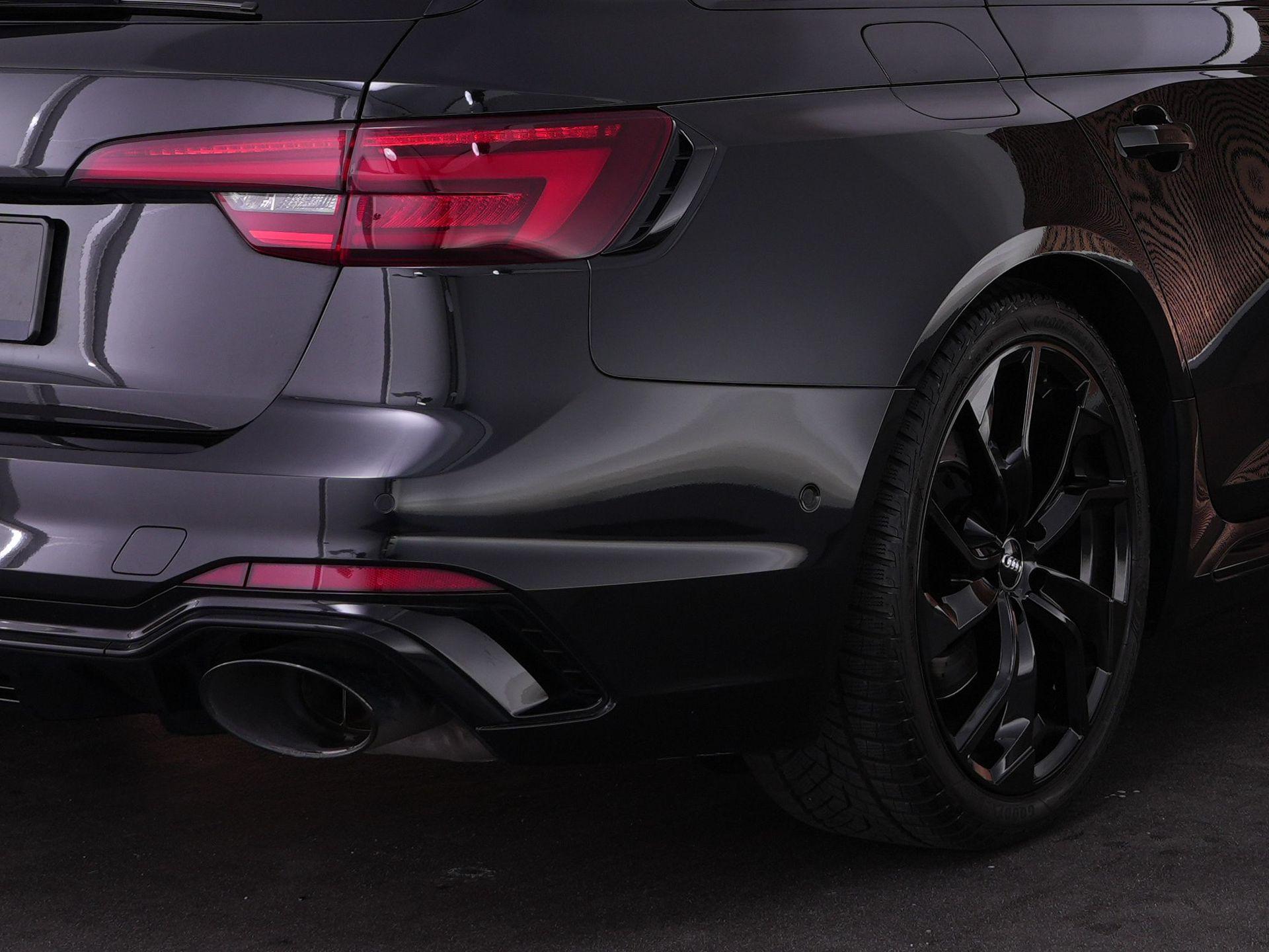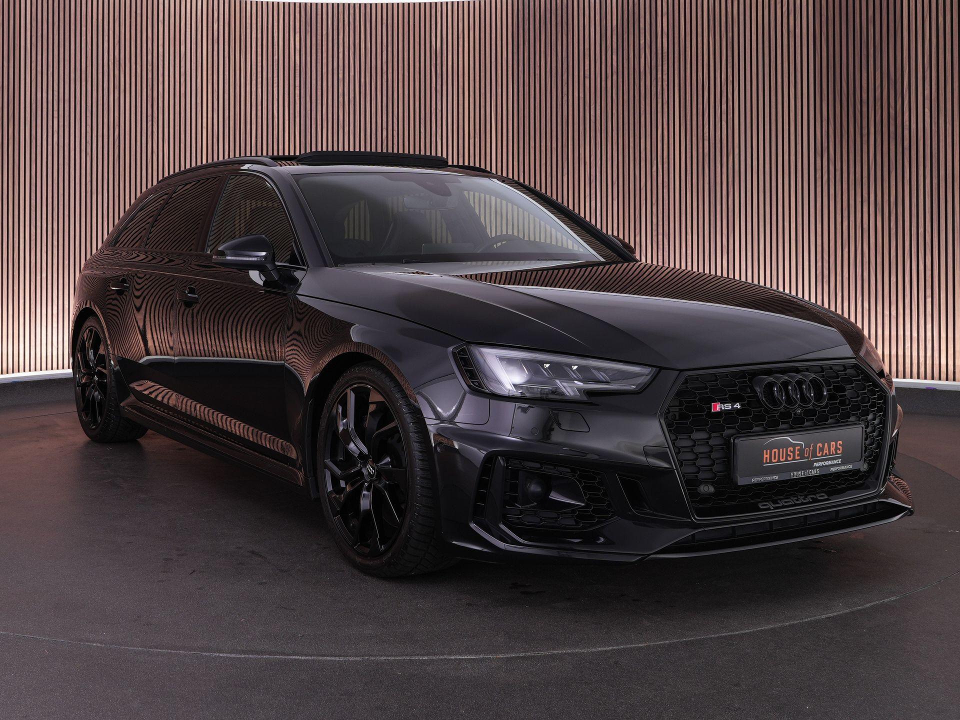 Audi RS4 Avant 2.9 TFSI quattro uit 2019 in Mythoszwart metallic. Een auto die alles in huis heeft: de ruimte en bruikbaarheid van een Avant, gecombineerd met het karakter en de prestaties die je van een echte RS verwacht. Dankzij de 2.9 biturbo V6, quattro-aandrijving en tiptronic automaat is dit een auto die onder alle omstandigheden indruk maakt, maar tegelijk ook comfortabel genoeg is voor dagelijks gebruik.