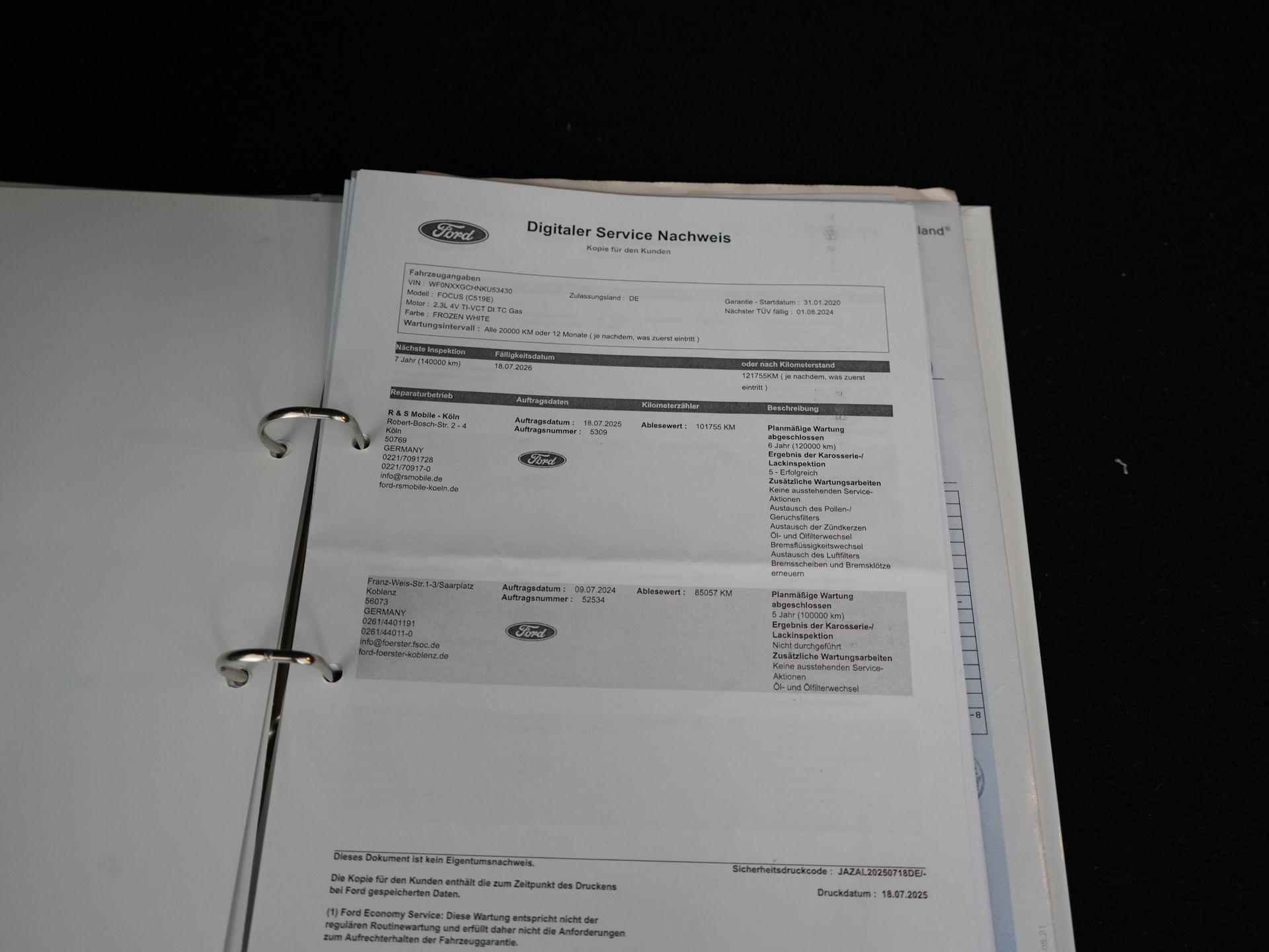18-07-2025 – 101.755 km – Ford onderhoud 6 jaar / 120.000 km uitgevoerd, carrosseriecontrole succesvol voltooid, interieurfilter vervangen, bougies vervangen, olie en oliefilter vervangen, remvloeistof vervangen, luchtfilter vervangen en remschijven + remblokken vóór vervangen